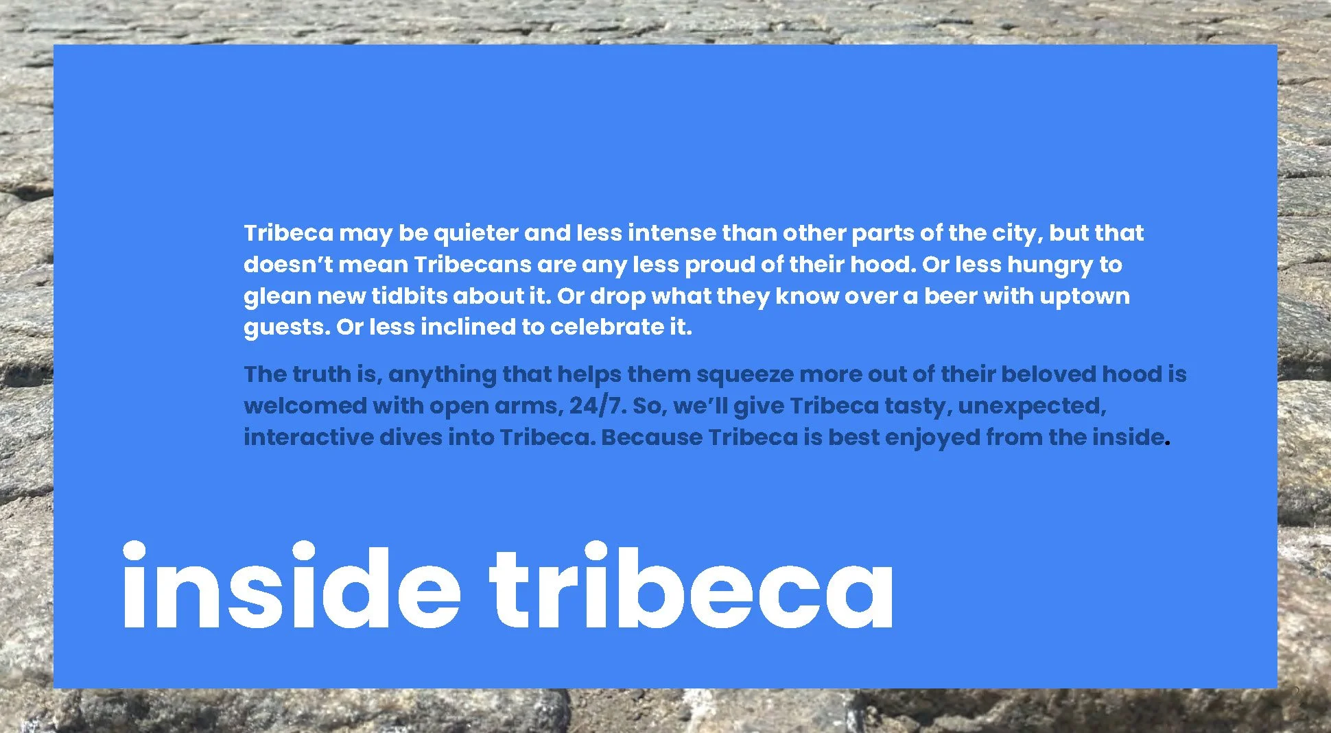 Citi was opening a state-of-the-art new branch at the base of their New York headquarters in Tribeca. To help celebrate the unique neighborhood they are in, they tapped me, a longtime Tribeca local, and my partner, of course, to help bring nine Tribeca ‘insider’ stories to life on their giant interactive touchscreen, located in the center of the new branch.