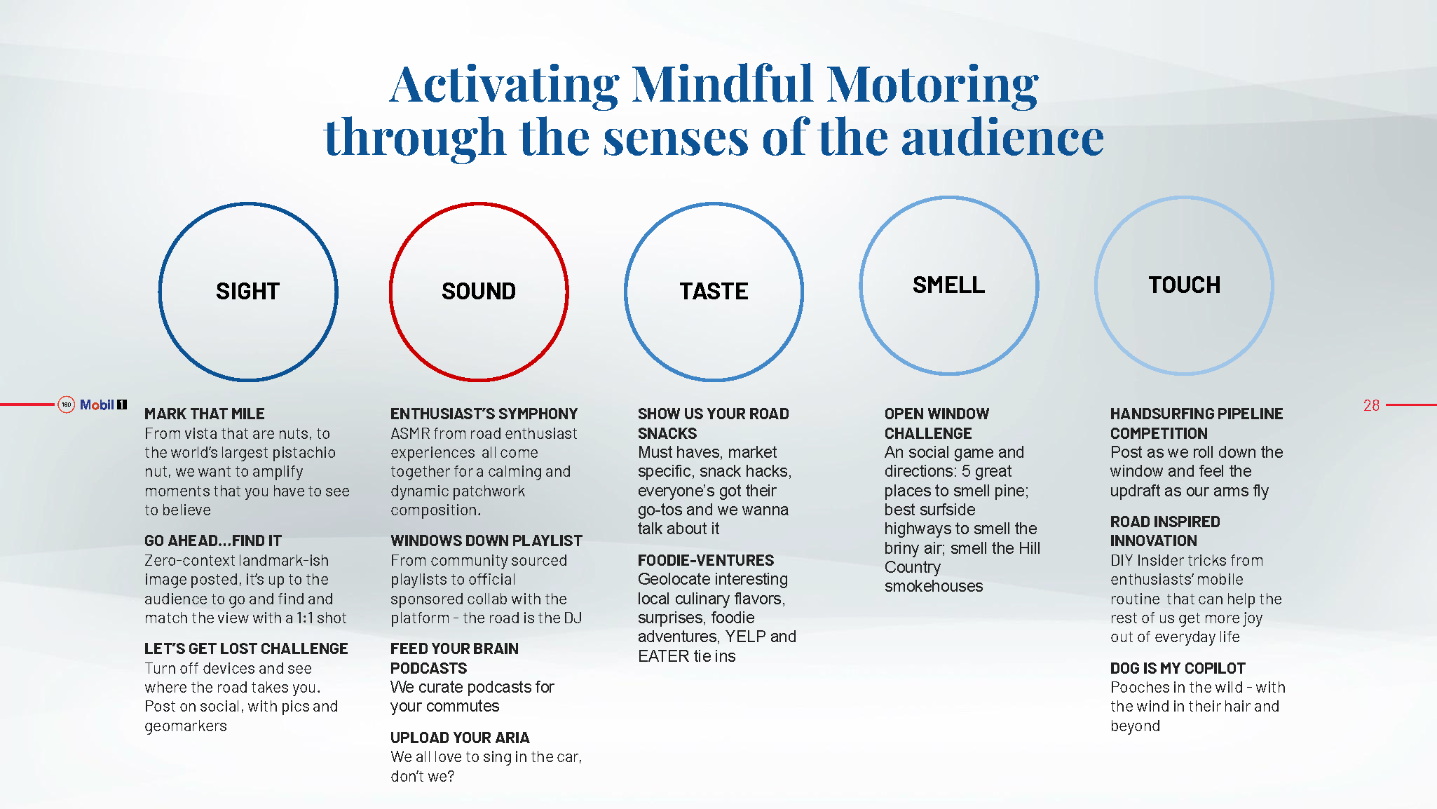 Mobil 1 had spent 50 years as a motor oil brand. The opportunity was to transform it into something far more powerful — a total road experience brand. We built a sensory-driven activation platform called #LoveEveryMile, anchored in the five senses of the driving enthusiast: Sight, Sound, Taste, Smell, and Touch. Each sense unlocked a distinct content, social, and experiential program — from UGC road photography amplified onto OOH and DOOH, to a Spotify playlist collaboration, to AR star-gazing off the car hood, to community-sourced road trip challenges. Fan-generated content lived on billboards. The road became the canvas.